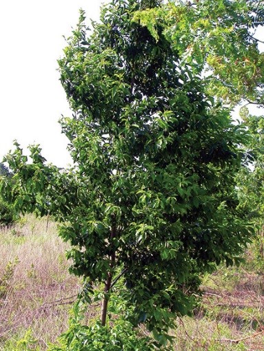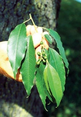 Native trees are 40ft tall; bark of larger trunks fissured and scaly, but thin. Leaves: alternate, simple, ovate to oblonglanceolate, 5-15 cm long, 2.5-5 cm wide, with finely toothed margins, glabrous or commonly with reddish hairs along the midrib beneath, near the base. Inflorescence is an oblong-cylindric raceme that is 10-15 cm long at the end of leafy twigs of the season, with numerous flowers; calyx tube of short lobes, petals 5, white. Fruits: berry-like, about 8-10 mm in diameter, obovoid, black when ripe; seed a single, black, ovoid stone 6-8 mm long. The common name is from the black color of the ripe fruits.