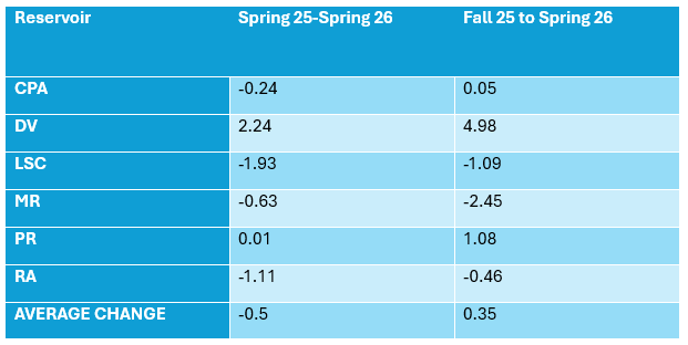 The 2026 Spring Water levels are complete! From Spring 2025 to Spring 2026, average levels across the District DECLINED by approximately half a foot (0.5 feet). Platte River increased by 0.15 foot as did Dwight-Valparaiso by 2.25 feet, however, the rest of the reservoirs decreased.