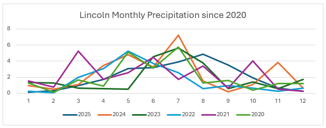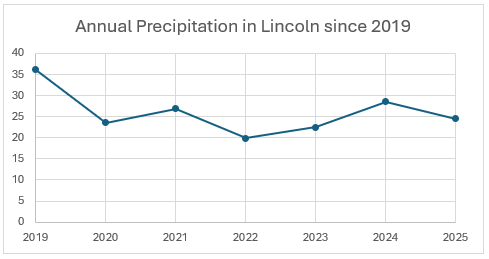 Missouri River GWR and Platte River GWR levels are very dependent on their respective river flows. The Dwight-Valparaiso Groundwater Reservoir showed the largest decrease in water level from Spring to Fall. Increased water pumping during the irrigation season, along with geological confinement, leads to the seasonal declines seen in that area. Lincoln averages 29.34 inches of rain per year, and we currently sit at 24.24 according to the University of Nebraska. 2025 started very dry with very little winter precipitation. Nearly 17 inches of 2025 precipitation total came in the months of April-August. Timely rain in the summer helped growers use less water than previous years.