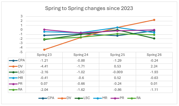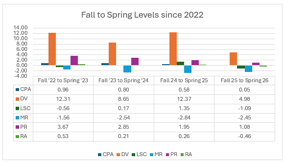 From Fall 2025 to Spring 2026, average water levels across the District increased by 0.35 feet. The largest increase came in the Dwight-Valparaiso reservoir with an average increase of nearly 5 feet. This reservoir tends to rebound quickly after pumping season due to it being a confined aquifer. The Missouri River reservoir, Lower Salt Creek, and Remaining Area showed a decrease since last fall. Lack of winter moisture from the Fall of 2025 to Spring 2026 has contributed to declines in shallower aquifers such as Lower Salt Creek.